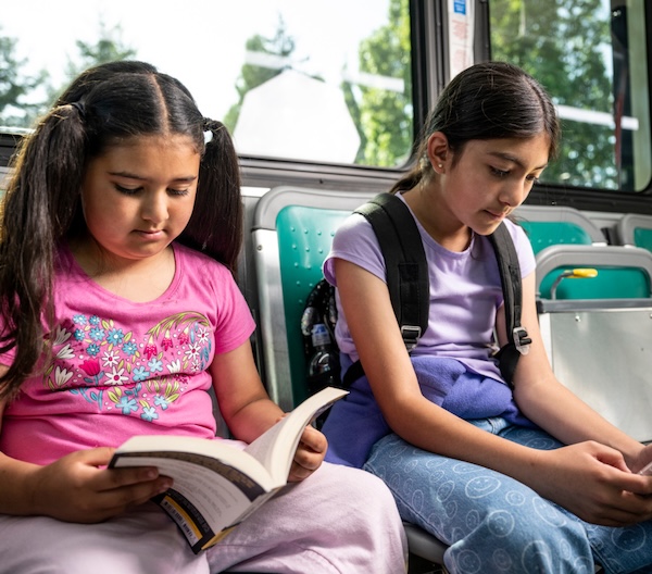 Please use headphones and avoid eating, drinking, or roughhousing while on the bus. Leave the priority seats near the front free for people who need them.
