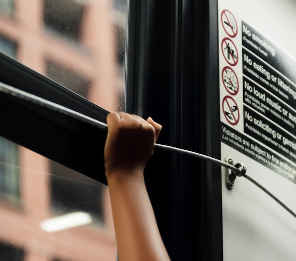 Signal the driver one block before your stop by pressing the stop button or pulling the cord along the window.